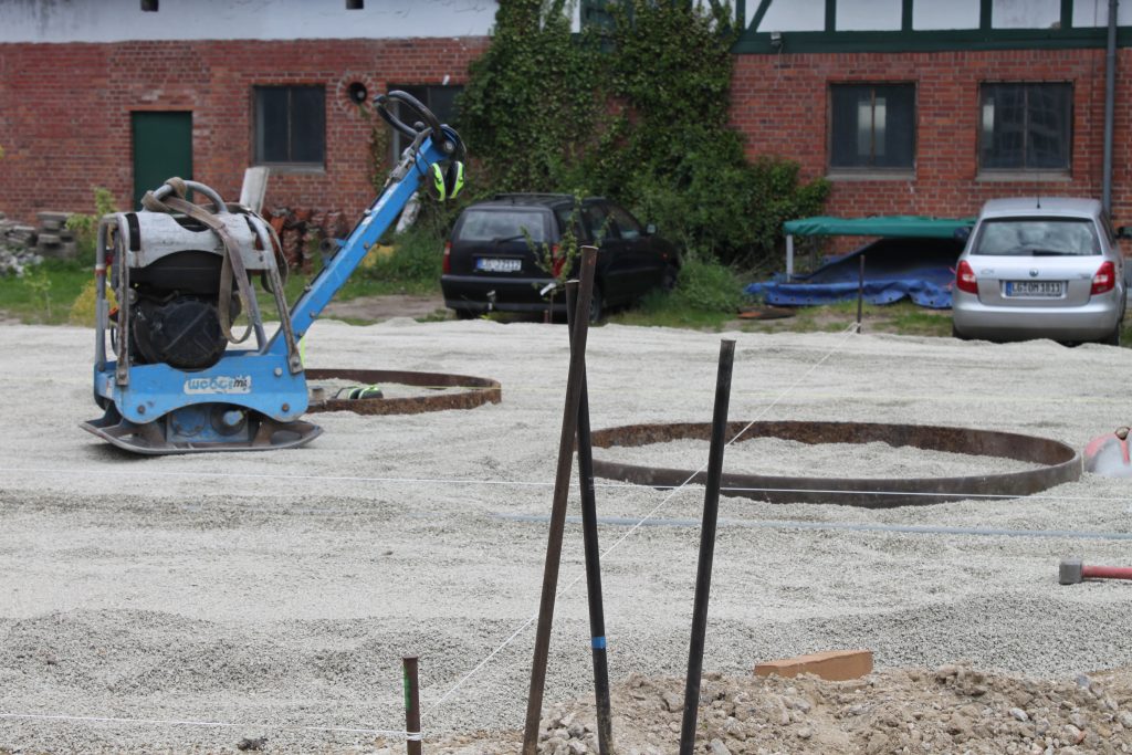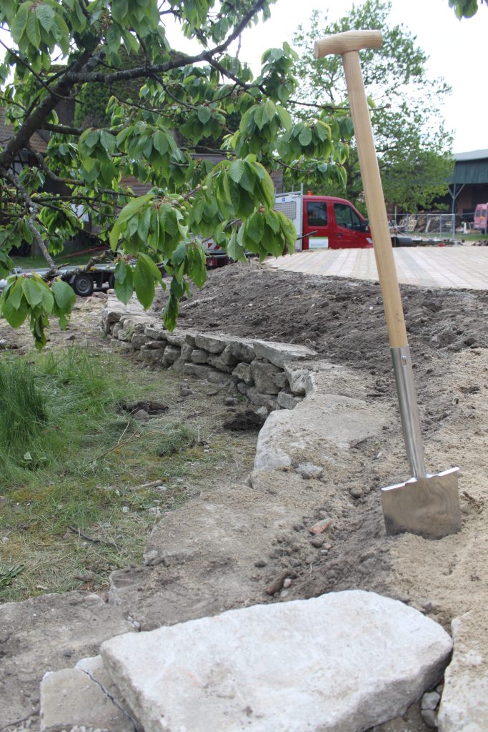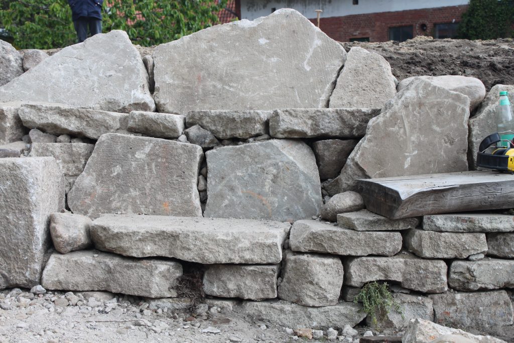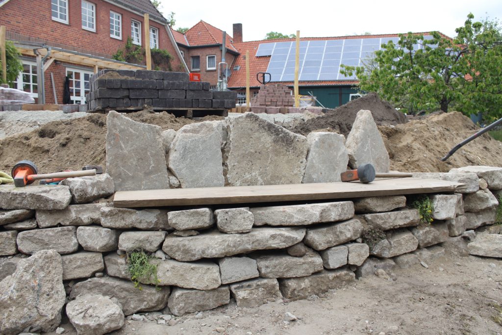 Für die Trockenmauern, die die Pflanzflächen einfassen, recyceln wir die Bodenplatte aus dem Neuen Stall. Dadurch können wir den ökologischen Fußabdruck des Baus gering halten. Die Betonklötze aus der ehemaligen Bodenplatte eignen sich dafür hervorragend. Zukünftig bieten sie vielen Insekten, anderen Kleintieren wie zum Beispiel Zauneindechsen und Erdkröten sowie Mauerpflanzen einen Lebens- und Nahrungsraum. Upcycling at it’s best. Auch die alten Wagenräder, die bei den Bodenarbeiten des Stallausbaus zu Tage gefördert wurden, finden einen neuen Platz auf unserem Hof: Sie markieren nun die Mittelpunkte der Pflasterkreise.