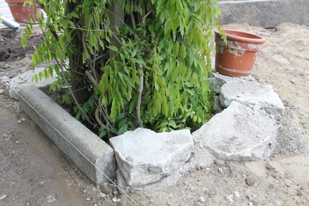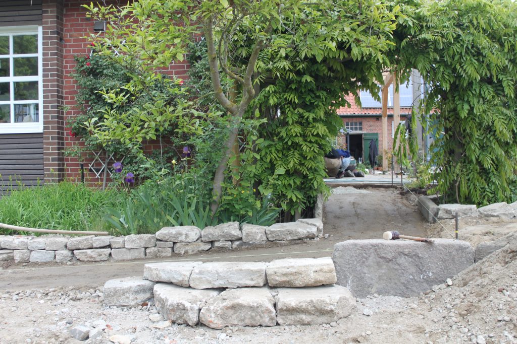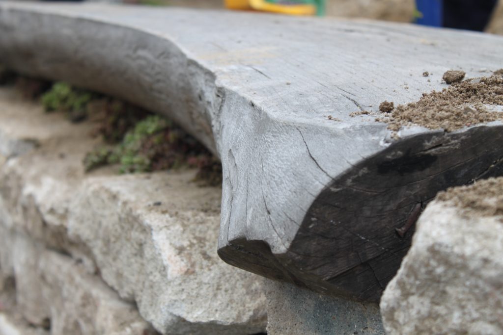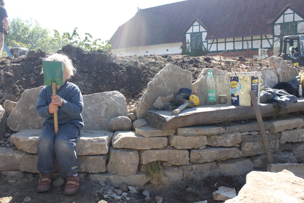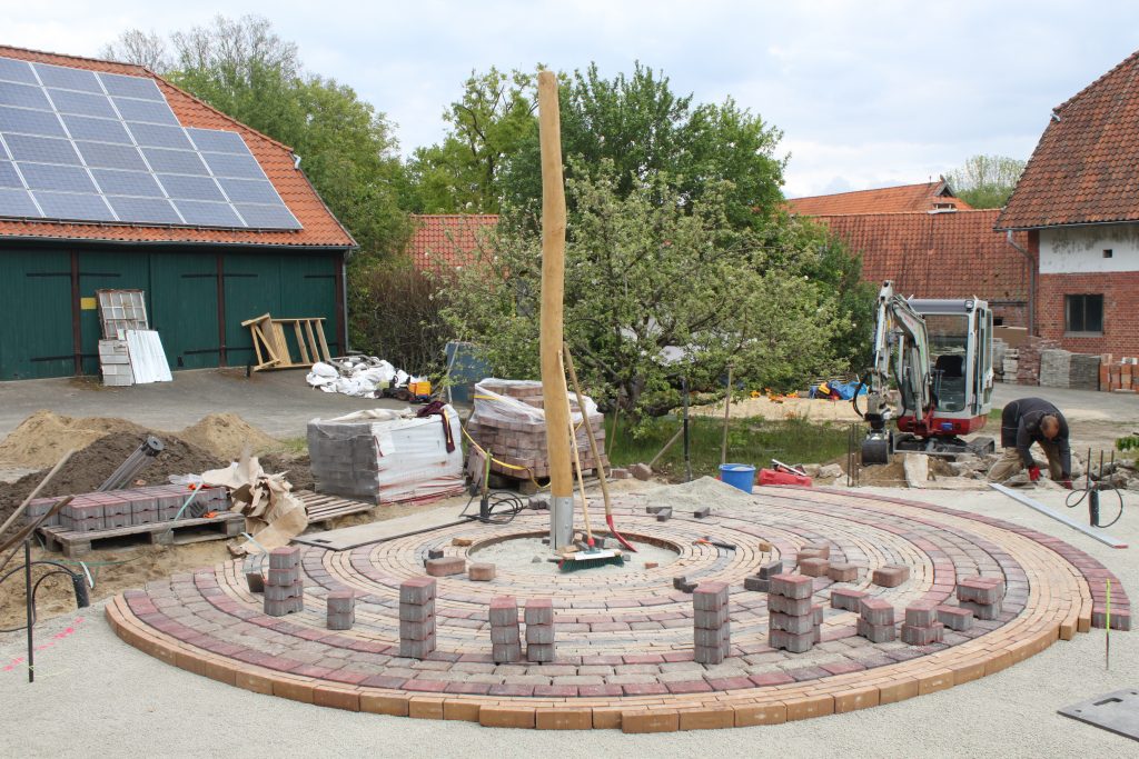 Für die Trockenmauern, die die Pflanzflächen einfassen, recyceln wir die Bodenplatte aus dem Neuen Stall. Dadurch können wir den ökologischen Fußabdruck des Baus gering halten. Die Betonklötze aus der ehemaligen Bodenplatte eignen sich dafür hervorragend. Zukünftig bieten sie vielen Insekten, anderen Kleintieren wie zum Beispiel Zauneindechsen und Erdkröten sowie Mauerpflanzen einen Lebens- und Nahrungsraum. Upcycling at it’s best. Auch die alten Wagenräder, die bei den Bodenarbeiten des Stallausbaus zu Tage gefördert wurden, finden einen neuen Platz auf unserem Hof: Sie markieren nun die Mittelpunkte der Pflasterkreise.
