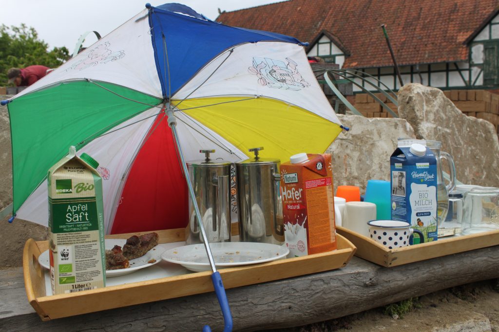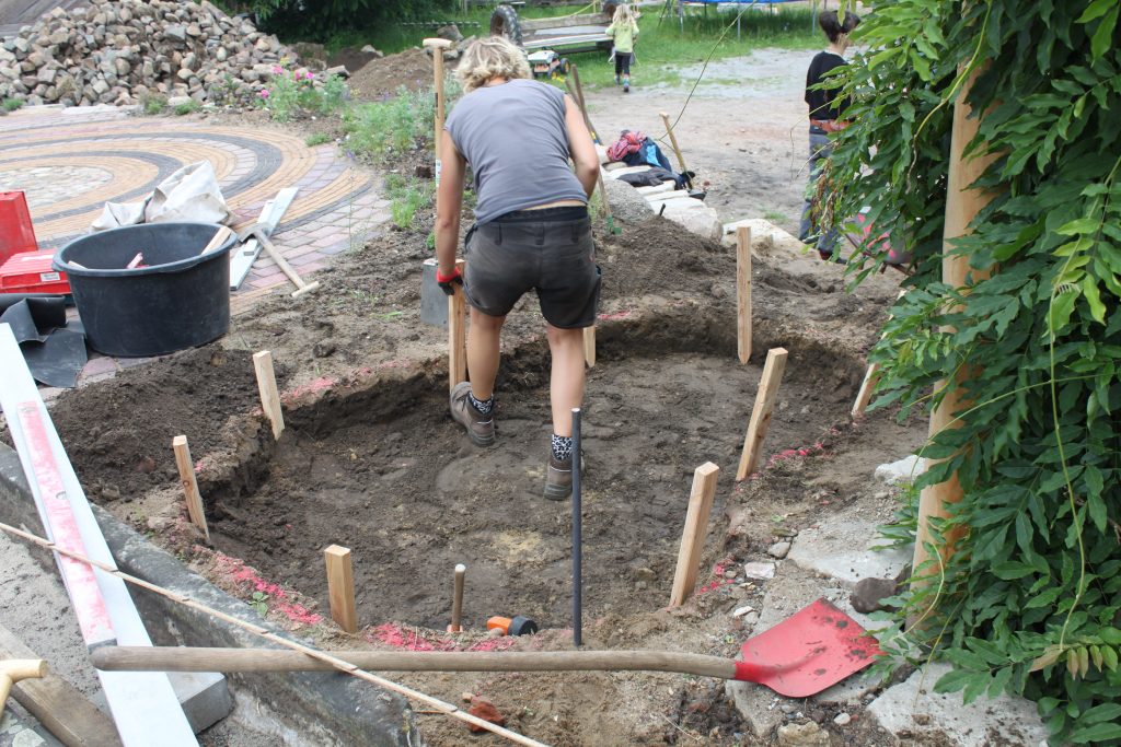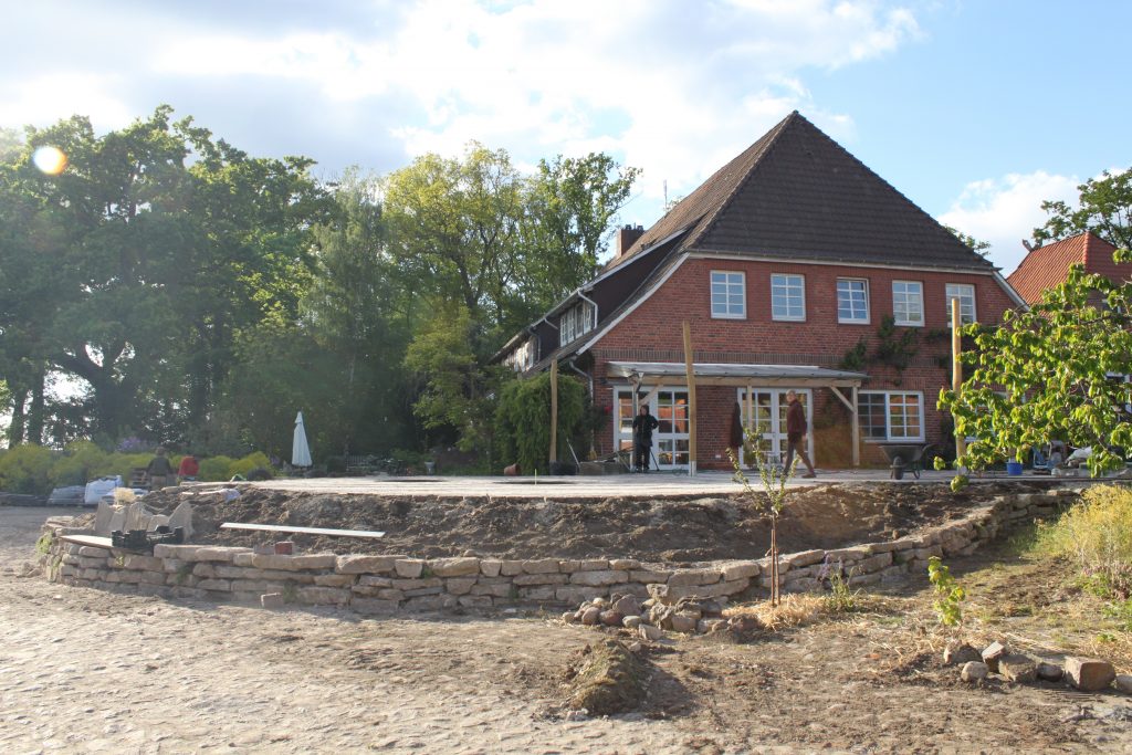 In letzter Zeit haben wir uns viele Gedanken über das Zusammenleben auf dem Hof in der Zukunft – nach Fertigstellung des Neuen Stalls – gemacht. Wir werden dann schließlich etwa doppelt so viele Menschen auf dem Hof sein! Hierbei ist uns aufgefallen, dass die Terrasse, die wir im letzten Jahr vor der Hofküche angelegt haben, im wahrsten Sinne des Wortes zu kurz gedacht war: Bereits jetzt ist der Platz knapp, um dort mit allen zusammen zu Essen. Außerdem ist sie an zwei Seiten nur über Treppen zugänglich und die einzige Rampe ist nicht ausreichend rollstuhlgerecht.