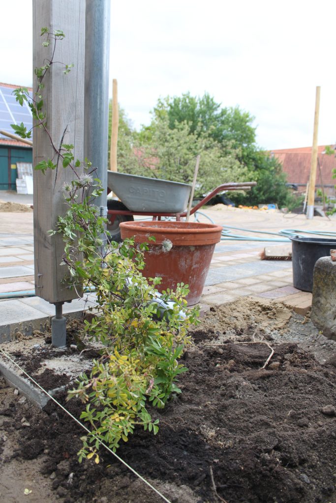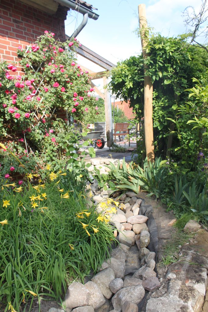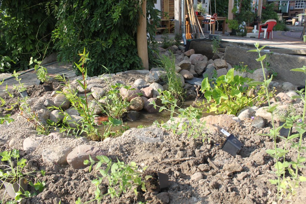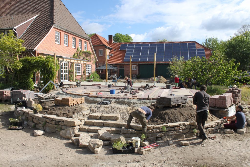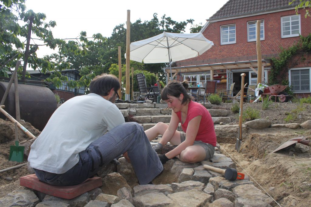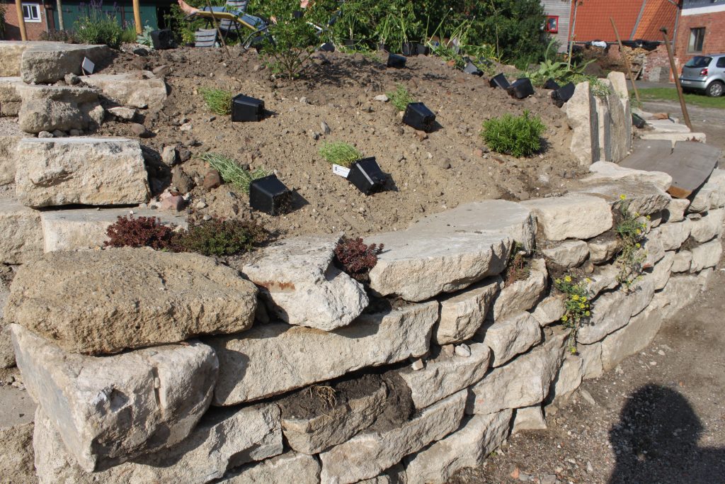 Obwohl wir nun doch die gesamte Terrasse pflastern, wollen wir trotzdem keine Betonwüste erschaffen. Naturnahe Geländegestaltung unter permakulturellen Gesichtspunkten ist uns sehr wichtig. Deshalb bauen wir nicht „nur“ eine Terrasse, sondern eine Terrasse, die von Gemüsebeeten und einem Kräuter-, Tee- und Duftbeet sowie heimischen Wildstaudenflächen gesäumt ist. Die Bingo Umweltstiftung Niedersachsen hat uns finanziell bei der Anschaffung der hierfür benötigten Pflanzen unterstützt. Vielen Dank! Auch die alten und neuen Obstbäume der Obstinsel werden in die Planung integriert und werden einer kleinen Liegewiese Schatten spenden.